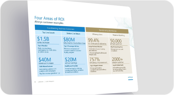 Confidential 2021 Alteryx, Inc. 19 Alteryx customer examples Four Areas of ROI Transforming Business Outcomes Top Line Growth Bottom Line Return Transforming Workforces Efficiency Gains Perpetual Upskilling $1.5B sales increase $40M revenue increase $20M annual savings 99.4% on-time parcel deliveries 757% efficiency improvement 50,000 people upskilled 2000+ people upskilled Healthcare Provider Annual savings by reducing unwarranted clinical variations in healthcare delivery Large National Retailer Automation of parcel routing and deliveries 11% cost savings in all inbound freight costs Top 5 Organic Grocer Pricing optimization, standardization and delivery timeliness Big 4 Consulting Firm Management, tax, audit consultants Top 50 Global Bank Automation across LOBs including trading, finance, tax, client servicing Top 5 Retailer Daily merchandising optimization for 100% SKUs in 2000+ stores F500 Manufacturer Automating customer LTV analytics and campaigns Top-line revenue growth in 1 yr $80M returned to the bottom line Top 3 Passenger Airline Discovery and analysis of unused rewards in customer loyalty program