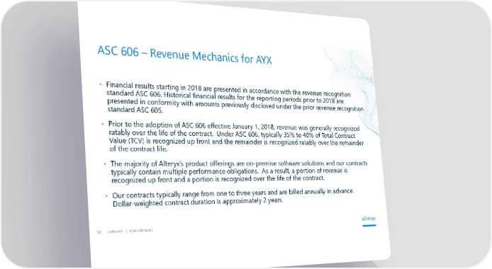 Confidential 2021 Alteryx, Inc. 32 Financial results starting in 2018 are presented in accordance with the revenue recognition standard ASC 606. Historical financial results for the reporting periods prior to 2018 are presented in conformity with amounts previously disclosed under the prior revenue recognition standard ASC 605. Prior to the adoption of ASC 606 effective January 1, 2018, revenue was generally recognized ratably over the life of the contract. Under ASC 606, typically 35% to 40% of Total Contract Value (TCV) is recognized up front and the remainder is recognized ratably over the remainder of the contract life. The majority of Alteryxs product offerings are on-premise software solutions and our contracts typically contain multiple performance obligations. As a result, a portion of revenue is recognized up front and a portion is recognized over the life of the contract. Our contracts typically range from one to three years and are billed annually in advance. Dollar-weighted contract duration is approximately 2 years. ASC 606 Revenue Mechanics for AYX
