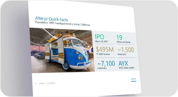 Confidential 2021 Alteryx, Inc. 3 $495M FY 2020 revenue ~1,500 Employees ~7,100 Customers AYX NYSE Ticker symbol IPO March 24, 2017 19 Offices worldwide Alteryx Quick Facts Founded in 1997, headquartered in Irvine, California Alteryx Investor Presentation | Interactive Page 2 Page 4Video Player is loading.Play VideoPauseSkip BackwardSkip ForwardUnmuteCurrent Time 0:01/Duration 2:58Loaded: 12.59%0:01Stream Type LIVESeek to live, currently behind liveLIVERemaining Time -2:57 1xPlayback RateChaptersChaptersDescriptionsdescriptions off, selectedCaptionscaptions settings, opens captions settings dialogcaptions off, selectedAudio TrackPicture-in-PictureFullscreenThis is a modal window.Beginning of dialog window. Escape will cancel and close the window.TextColorWhiteBlackRedGreenBlueYellowMagentaCyanOpacityOpaqueSemi-TransparentText BackgroundColorBlackWhiteRedGreenBlueYellowMagentaCyanOpacityOpaqueSemi-TransparentTransparentCaption Area BackgroundColorBlackWhiteRedGreenBlueYellowMagentaCyanOpacityTransparentSemi-TransparentOpaqueFont Size50%75%100%125%150%175%200%300%400%Text Edge StyleNoneRaisedDepressedUniformDrop shadowFont FamilyProportional Sans-SerifMonospace Sans-SerifProportional SerifMonospace SerifCasualScriptSmall CapsResetDoneClose Modal DialogEnd of dialog window.