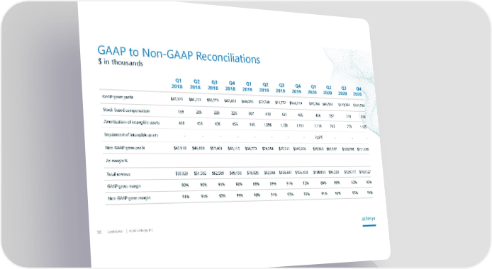 Confidential 2021 Alteryx, Inc. 36 $ in thousands GAAP to Non-GAAP Reconciliations Q1 2018 Q2 2018 Q3 2018 Q4 2018 Q1 2019 Q2 2019 Q3 2019 Q4 2019 Q1 2020 Q2 2020 Q3 2020 Q4 2020 GAAP gross profit $45,325 $46,233 $56,779 $82,433 $68,020 $72,748 $93,752 $144,239 $95,784 $86,598 $119,303 $149,784 Stock-based compensation 139 206 226 226 307 410 431 486 436 597 714 803 Amortization of intangible assets 446 451 456 456 446 1,096 1,128 1,131 1,118 762 773 1,105 Impairment of intangible assets - - - - - - - - 2,025 - - - Non-GAAP gross profit $45,910 $46,890 $57,461 $83,115 $68,773 $74,254 $95,311 $145,856 $99,363 $87,957 $120,790 $151,692 As margin % Total revenue $50,329 $51,502 $62,589 $89,150 $76,020 $82,043 $103,397 $156,450 $108,831 $96,233 $129,717 $160,527 GAAP gross margin 90% 90% 91% 92% 89% 89% 91% 92% 88% 90% 92% 93% Non-GAAP gross margin 91% 91% 92% 93% 90% 91% 92% 93% 91% 91% 93% 94%