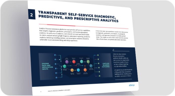 2 TRANSPARENT SELF-SERVICE DIAGNOSTIC, PREDICTIVE, AND PRESCRIPTIVE ANALYTICS Analytic Process Automation platforms must provide self-service capabilities A first-time user can experience results from data access that simplify diagnostic, predictive, prescriptive, and location/geospatial to diagnostic, predictive, prescriptive, or geospatial analytics. In each area of analytics, users should not need specialized skills. analytics, and automate processes via visual, guided An entire analysis including high-frequency automated reporting, predictive steps. The result is a view of the entire business process analytics including modeling options, and prescriptive analytics should be that reflects faster, completely automated outcomes. achievable via an automated drag-and-drop experience. A best-in-class Analytic Process Automation Data Predictive Explainable Geospatial platform should enable any Blending Auto ML AI Analytics user across the organization DIVERSE Process LIMITLESS to achieve results in hours DATA AND Automation BUSINESS or days without requiring APPLICATION OUTCOMES any specialized skillset. INPUTS Data Prep Publishing & Proļ¬ling App Controls APA platforms provide hundreds Diagnostic Prescriptive Code-Free of drag-and-drop automation Reporting Analytics Data Science building blocks, enabling users to deliver outcomes in hours. 4 ANALYTIC PROCESS AUTOMATION BUYERS GUIDE