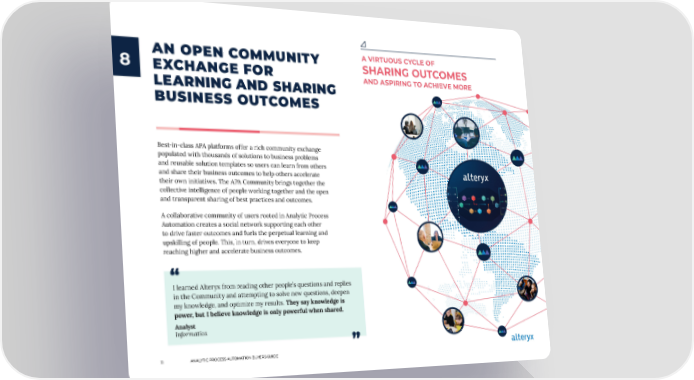 AN OPEN COMMUNITY A VIRTUOUS CYCLE OF 8 EXCHANGE FOR SHARING OUTCOMES LEARNING AND SHARING AND ASPIRING TO ACHIEVE MORE BUSINESS OUTCOMES Best-in-class APA platforms offer a rich community exchange populated with thousands of solutions to business problems and reusable solution templates so users can learn from others and share their business outcomes to help others accelerate their own initiatives. The APA Community brings together the collective intelligence of people working together and the open and transparent sharing of best practices and outcomes. A collaborative community of users rooted in Analytic Process Automation creates a social network supporting each other to drive faster outcomes and fuels the perpetual learning and upskilling of people. This, in turn, drives everyone to keep reaching higher and accelerate business outcomes. “ I learned Alteryx from reading other people’s questions and replies in the Community and attempting to solve new questions, deepen my knowledge, and optimize my results. They say knowledge is power, but I believe knowledge is only powerful when shared. Analyst Informatica “ 11 ANALYTIC PROCESS AUTOMATION BUYERS GUIDE
