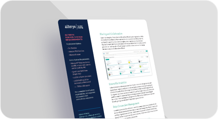 ALTERYX Sharing and Collaboration SERVER SYSTEM Ensure the integrity of analytics models and workflows in your organization. With REQUIREMENTS Alteryx Server analysts can share and collaborate on analytic workflows, macros, Deployment Options and analytic apps with other users throughout your organization. Cut down on duplications and build better collaboration between analysts. Built-in version control • On-Premise provides the tracking and roll back changes needed to ensure users are leveraging • Amazon Web Services the latest analytic models and workflows. • Microsoft Azure Server System Requirements • Microsoft® Windows Server 2008R2 or later with current service pack (64-bit) • Quad Core Intel Xeon (single chip) • 2.5GHz or faster processor • 16GB RAM (32GB for increased performance) • > 1 TB free disk space Extensible Analytics For a complete list of system Embed Alteryx workflows processes directly into other internal applications and requirements, and supported expose these reusable analytics to business users across your enterprise using the data sources visit: Alteryx APIs and Software Developer Kits (SDKs). Or share analytics applications www.alteryx.com/server to empower your business decision makers to get the insights they need, when they need it so analytic teams can focus on strategic projects instead of recreatingad- hoc views of existing insights and reports. All of this is done behind your corporate firewall, giving you and your IT department peace of mind. Data Connection Management About Alteryx Centralize your practice and make it easier to manage analytics across distributed Alteryx Inc. offers an end-to- teams with an easy-to-administer data connection manager that doesn’t break your end, analytics platform which existing IT governance controls. Ensure users only access the data for which they empowers people to break have permissions - grant access, remove access, create new connections, and view data barriers, deliver insights, all data connections and who has access. and experience the thrill of getting to the answer faster. Business analysts and data Flexible Deployment and High Availability scientists alike can discover, Built-in, automatic recovery and fault-tolerant capabilities mean you never have to share and prep data, perform worry about downtime, and IT can have the confidence that they can make software analysis, and deploy and updates and perform critical analytic backups regularly. Deploy on-premise or in the manage analytic models. cloud, so you can scale up or out for improved performance and availability as needed. Enterprises all over the world Offload critical reports, models and insights, and protect against crashes, power rely on Alteryx to deliver outages, system failures, and even lost laptops. actionable insights daily. 3345 Michelson Dr., Ste. 400, Security and Analytic Governance Irvine, CA 92612 Central, standardized administration, management, and monitoring, so IT teams +1 888 836 4274 can rest assured that corporate security rules for access, permissions, and analytic www.alteryx.com governance are in place. With detailed usage reporting, auditing and standardized Alteryx is a registered logging tools, coupled with corporate authentication, permission and encryption trademark of Alteryx, Inc. 9/17 protocols your IT teams and system administrators can rest assured that your data remains safe and secure. VISIT ALTERYX.COM Alteryx Server DataSheet | 2